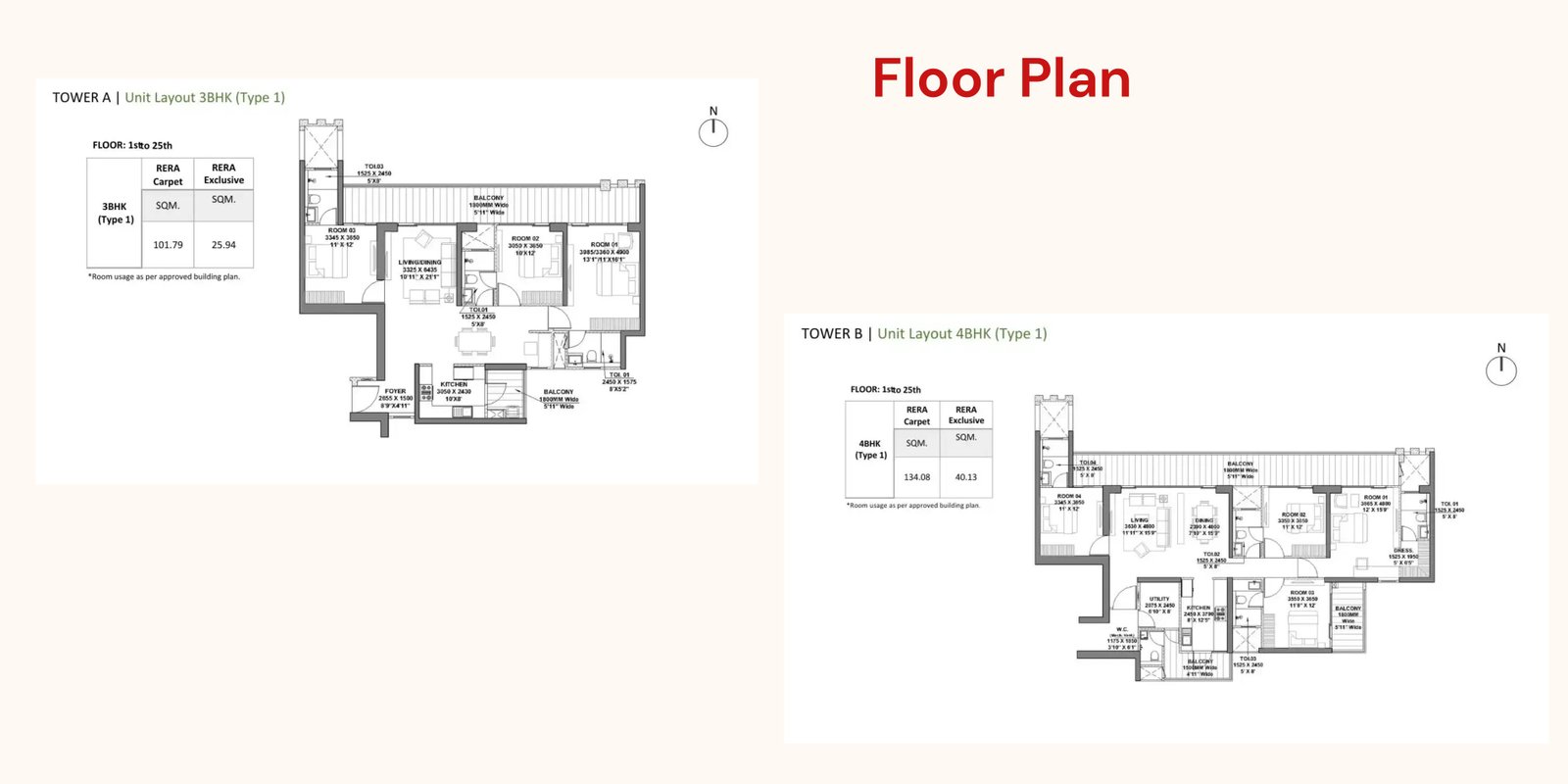 The project offers spacious 3 BHK, 3.5 BHK, and 4.5 BHK luxury apartments ranging from approximately 1950 sq. ft. to 3700 sq. ft.
