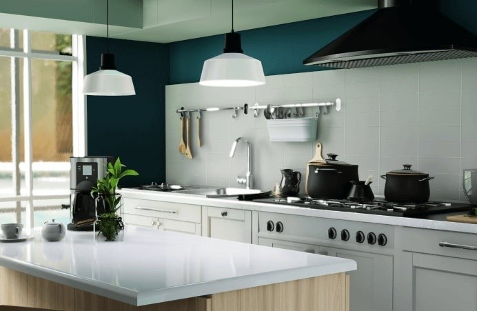 Modular kitchen layout with a granite countertop